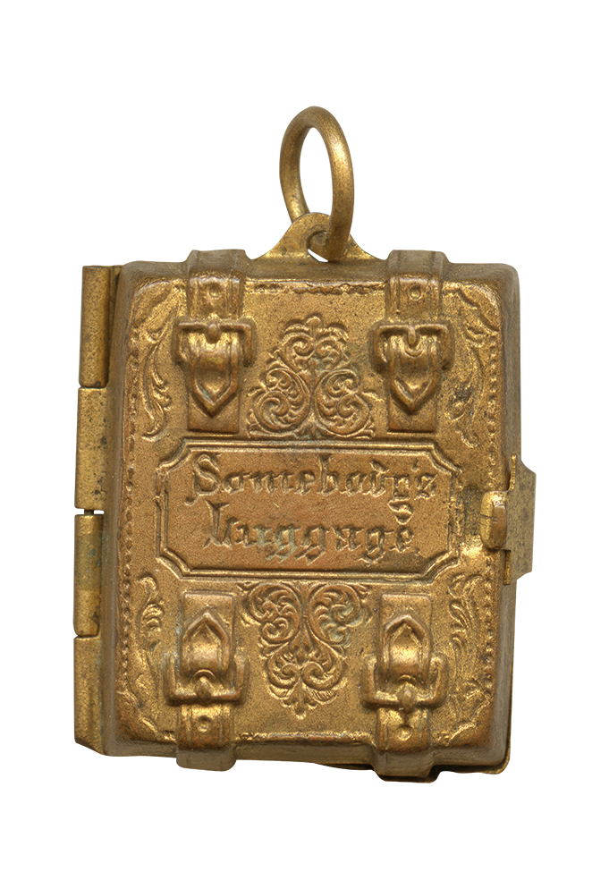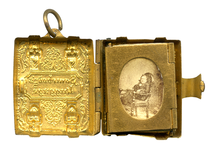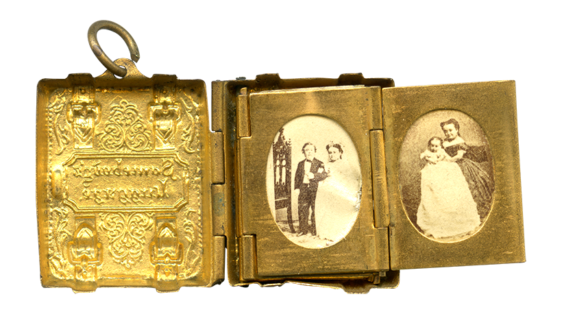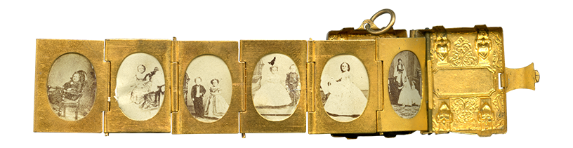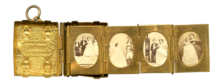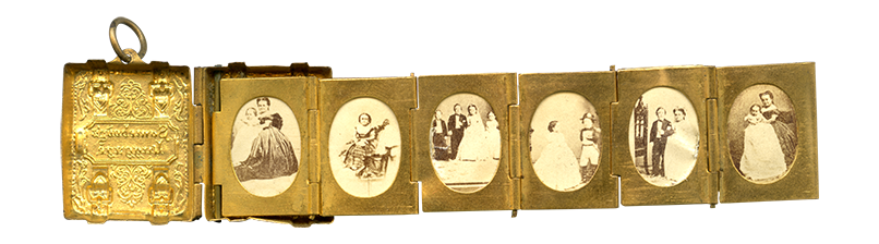 Some special guests received a brass locket containing 12 miniature albumen pictures of the couple: measuring only 1 inch on each side, it may be the smallest wedding album ever. The locket, which can be hung from a necklace, features portraits of the couple taken by one of the earliest American photographers, Mathew B. Brady.