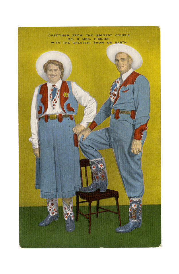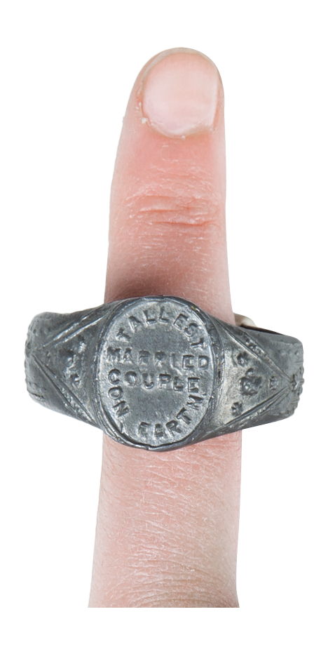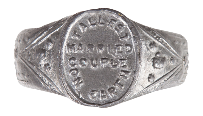 Fast-forward 50 years to the 1930s, and another marriage, this time between Elfriede and Gottlieb Fischer, was dominating the headlines. Both giants, these song-and-dance performers met doing vaudeville. They were wedded in Hamburg in 1933 and became known as the tallest married couple in the world. When they travelled to the United States, they joined the famous Ringling Brothers and Barnum & Bailey Circus and took their act around the country. As well as the Tom Thumb wedding album, the Fun Archaeology includes a ring, measuring 3,4 cm in diameter, sold as a souvenir at one of their performances. The giant rings were made by melting down softer metals — in this case lead — and putting them into specially designed molds to set. The words on this one read: “Tallest Married Couple on Earth.”