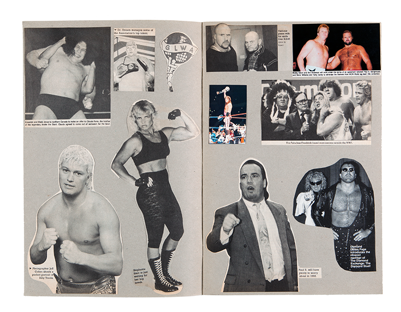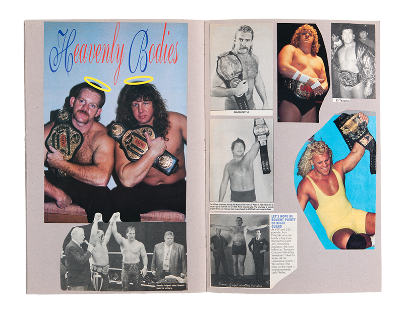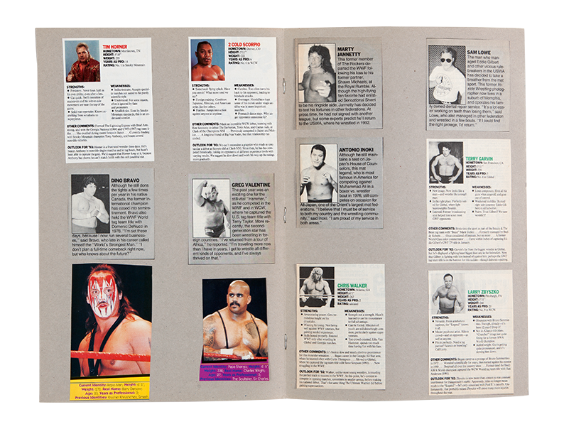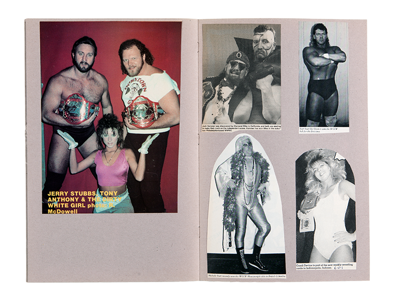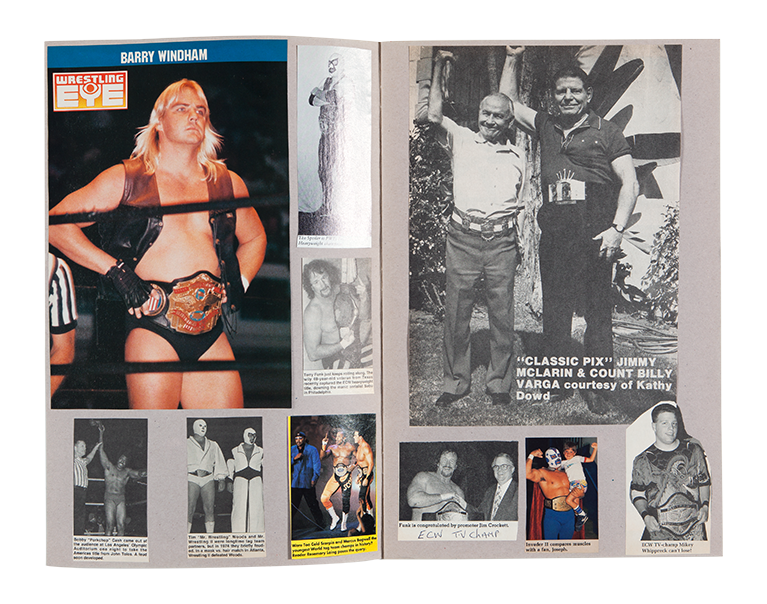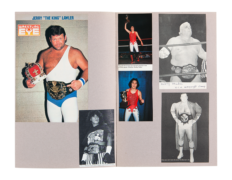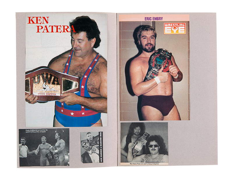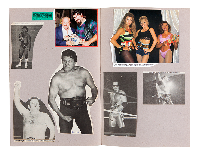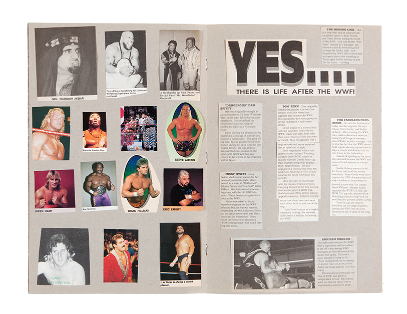 Three wrestling scrapbooks made by a WWF (World Wrestling Federation) fan, entitled “Memories 2” (28 pages); “Where Are They?” (20 pages); and “Federation Champs 4” (28 pages). Various offset black-and-white and color press clippings. Each measures 24,8 x 37,6 cm.