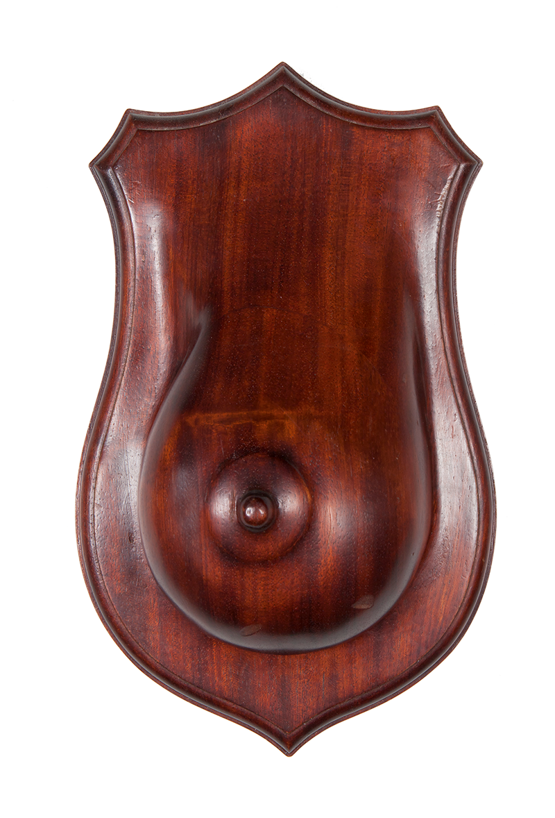 This item is an ebony sculpture depicting the left breast of a woman. The author is anonymous and the sculpture is handmade, not an industrial product. It seems to be a sort of hunting trophy because of its classical trophy shape. It could be probably a post colonialism joke referring to a competition, or a sort of a funny souvenir of “hunting” a black woman as the wood used is dark. The dimensions of the trophy are 19x31,2cm; it was meant to be hung and on the back we can read the hand inscription “Mot flicker du 27/01/96 au 30/10/96”.